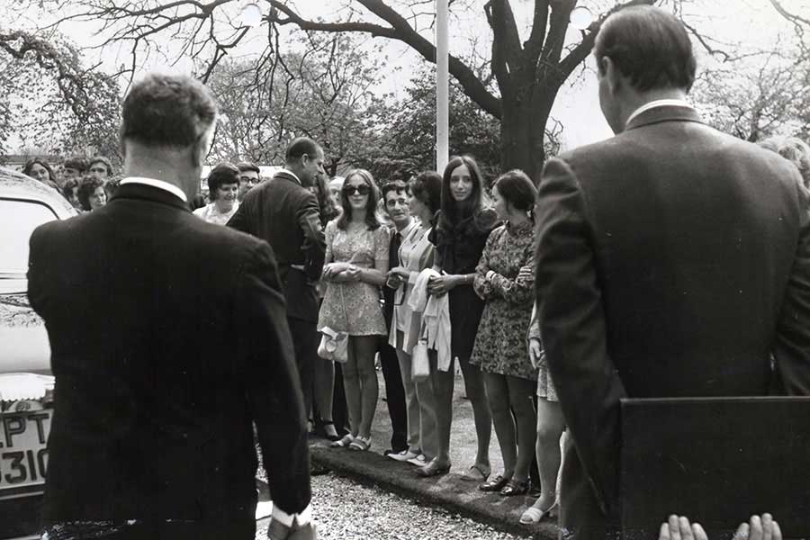 Prince Philip talking to MD Paul Haussauer during a visit to Clan Motor Company, 1972.