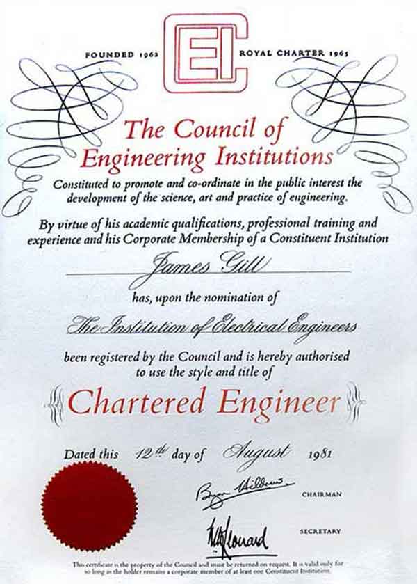 Registered as a Chartered Engineer by the Engineering Council on the recommendation of