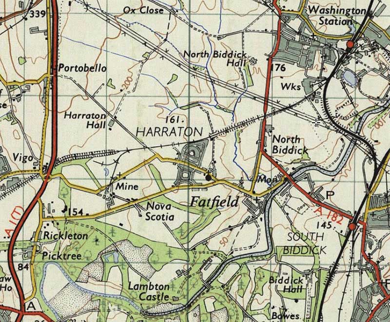 Haggis Hall's location relative to St. George's Church, Fatfield School, Biddick Lane, Worm Hill, Fatfield Bridge.