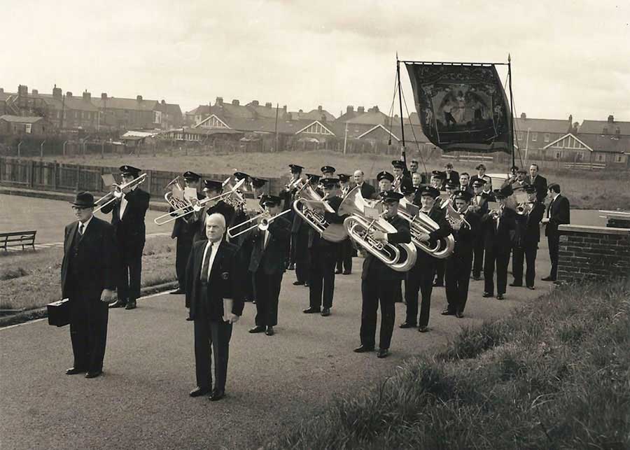 Washington Glebe Colliery Band & Lodge Banner, outside the Glebe Colliery Miners' Welfare Hall.